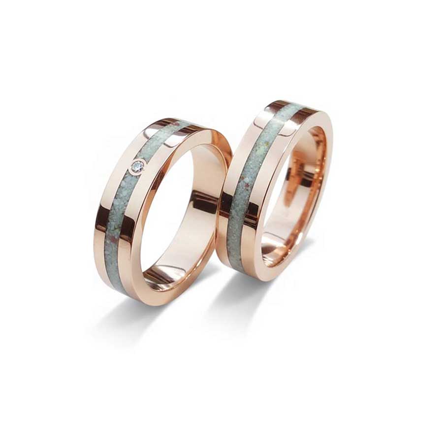 De ringen zijn met de hand vervaardigd uit hoogwaardig 14-karaats roségoud. De warme, koperachtige gloed van het goud vormt een schitterend contrast met de subtiele, kristalachtige inleg van authentiek zand, afkomstig van het paradijselijke strand van Cas Abao.